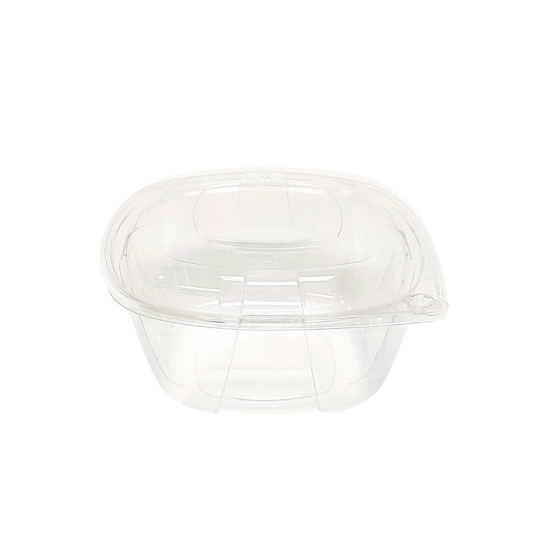 VG PET Tamper Evident Square Bowls are perfect for leaf or pasta salads, cut vegetables, cut fruit, nuts, candies and other specialty foods.. Available in 5” (Small), 7.5” (Medium) and 9” (Large) convenient diameters. These square bowl options are stackable and increase the shelf space efficiency by 25% over round bowls. Crystal clear lids give the consumer a clear view before buying and they are also crack-resistant and spill-proof to ensure safe and stable handling. Black bases available in custom option.